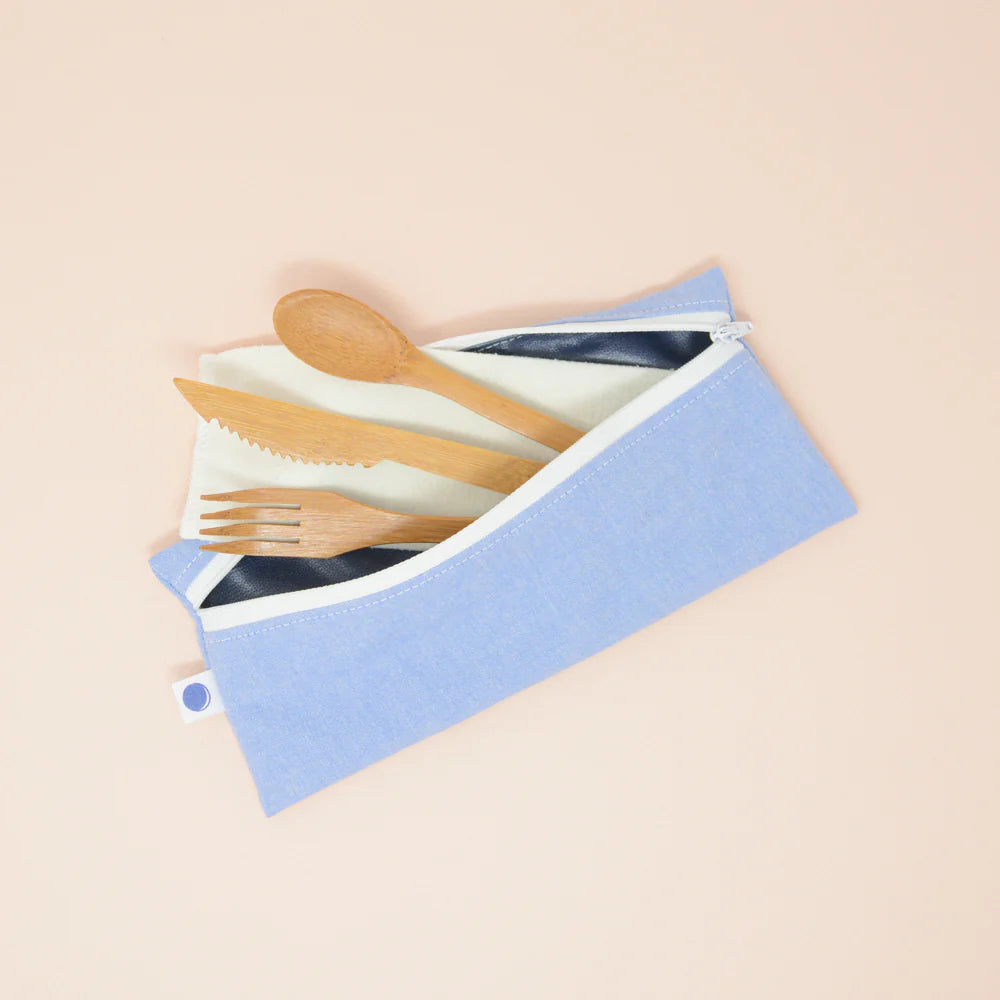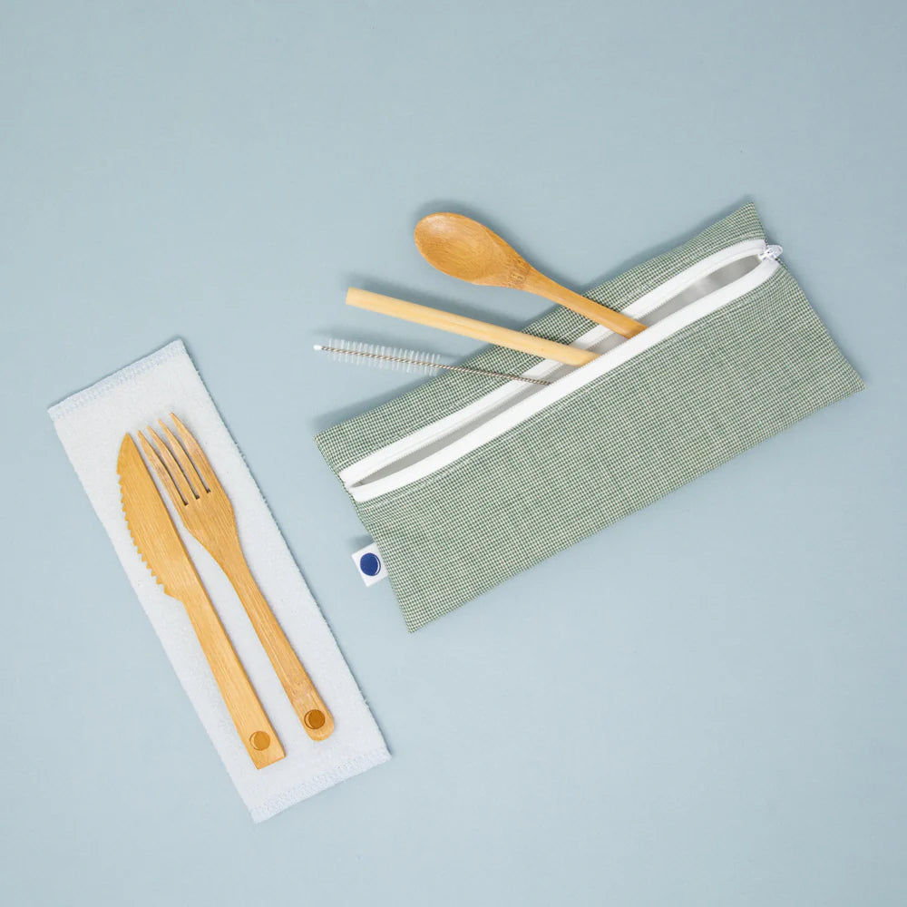 Contient un trio d'ustensiles en bambou, une anapkin et un sac à collation format wrap;