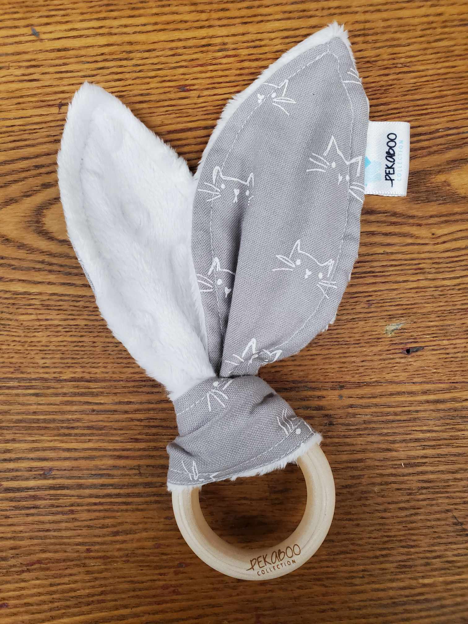 Découvrez notre jouet de dentition oreille de lapin fait de bois et de minky pour soulager les dents de bébé lors de la poussée dentaire !